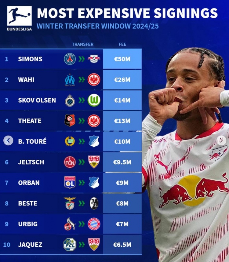 2月10日訊 五大聯(lián)賽冬窗已經(jīng)關(guān)閉,《轉(zhuǎn)會市場》也列出了德甲冬窗轉(zhuǎn)會費最貴榜,哈維-西蒙斯居首。