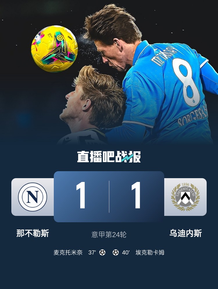 意甲第24輪,那不勒斯1-1戰(zhàn)平烏迪內(nèi)斯。上半場,麥克托米奈率先打破僵局;埃克勒卡姆扳平比分。下半場,雙方均無建樹。