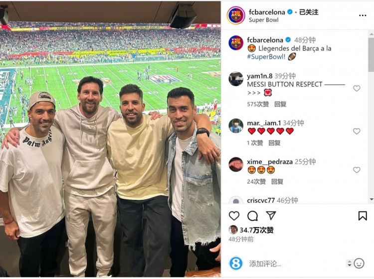 梅西、蘇亞雷斯、阿爾巴、布斯克茨一起觀看了比賽,巴薩社媒曬出四人的合照,配文:“巴薩傳奇在超級(jí)碗。”