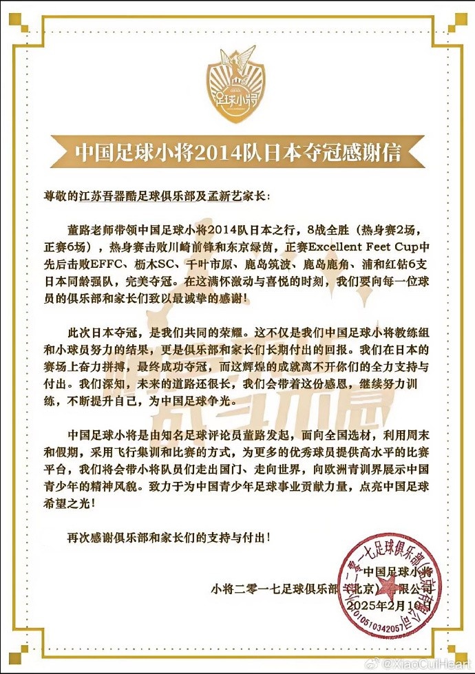 2月11日訊 前往日本參加杯賽的中國足球小將2014年齡段隊先后擊敗日本同齡強隊順利奪冠,賽后中國足球小將2014年齡段隊發(fā)布了感謝信。