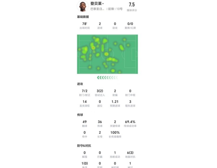 技術統(tǒng)計數(shù)據(jù)顯示,登貝萊本場比賽7射兩正,3次過人兩次成功,3次錯失重大機會。另外,登貝萊有兩次關鍵傳球,兩次長傳全部成功。