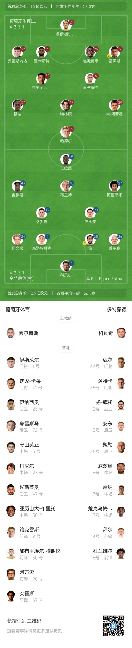 近期戰(zhàn)績方面,葡萄牙體育各項賽事5場比賽2勝2平1負,多特蒙德2勝1平2負。