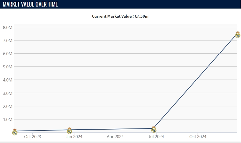 勞爾-阿森西奧本賽季才進(jìn)入皇馬一線隊(duì),至今代表球隊(duì)出場21次,在西甲送出過一記助攻。值得一提的是,這位小將在連續(xù)兩場硬仗中都首發(fā)出場,球隊(duì)1-1戰(zhàn)平馬競、3-2戰(zhàn)勝曼城。目前球員德轉(zhuǎn)身價(jià)僅為750萬歐元。