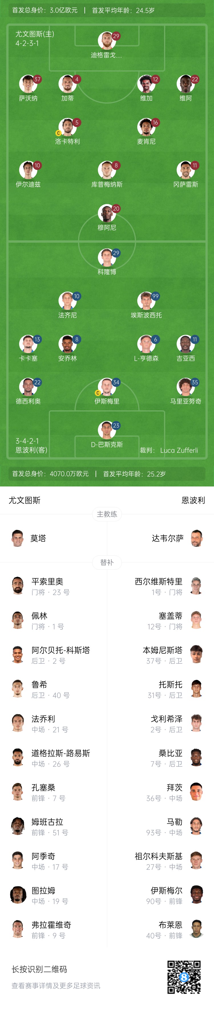 2月2日訊 北京時間19點30分,意甲第23輪,尤文vs恩波利,賽前雙方首發(fā)公布。