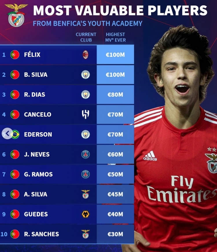 2月13日訊 《轉(zhuǎn)會市場》統(tǒng)計了本菲卡青訓(xùn)歷史身價最貴榜,菲利克斯和B席1億歐并列居首。