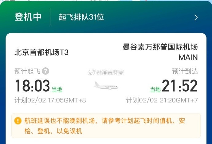 根據(jù)博主“埃萊夫賽”查詢的信息顯示,國安隊預(yù)計在今天17:05起飛的飛機已經(jīng)延時到18:03,抵達曼谷的時間也由21:20變更為21:52。