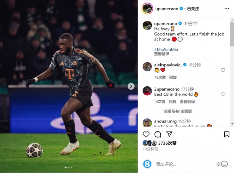 2月13日訊 歐冠淘汰賽附加賽首回合比賽,拜仁客場2-1擊敗凱爾特人,拜仁中衛(wèi)于帕梅卡諾當(dāng)選全場最佳球員。