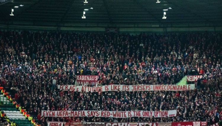 本場比賽拜仁球員身穿黑色客場球衣,拜仁球迷在看臺上掛出橫幅:“拜仁股份公司(FCB AG)的態(tài)度就像它的球衣——不可識別。即使歐足聯(lián)-黑手黨也說:紅白球衣是唯一的選擇?!?/p>