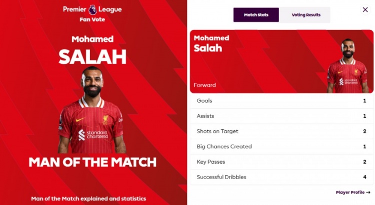 全場比賽,薩拉赫2次射正,打進1球,送出1次助攻,他還創(chuàng)造了1次重要的進球機會,送出2次關(guān)鍵傳球,4次過人成功。