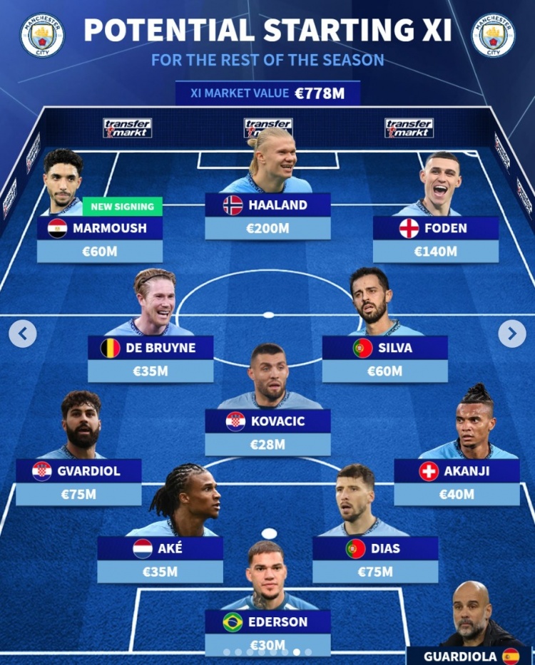 前鋒:馬爾穆什(6000萬)、哈蘭德(2億)、福登(1.4億)