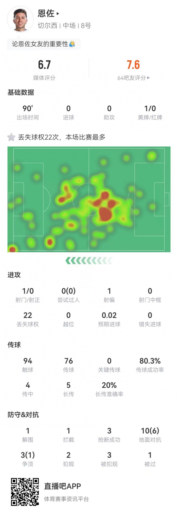 2月15日訊 切爾西本輪英超0-3完敗布萊頓,恩佐本場數(shù)據(jù)如下: