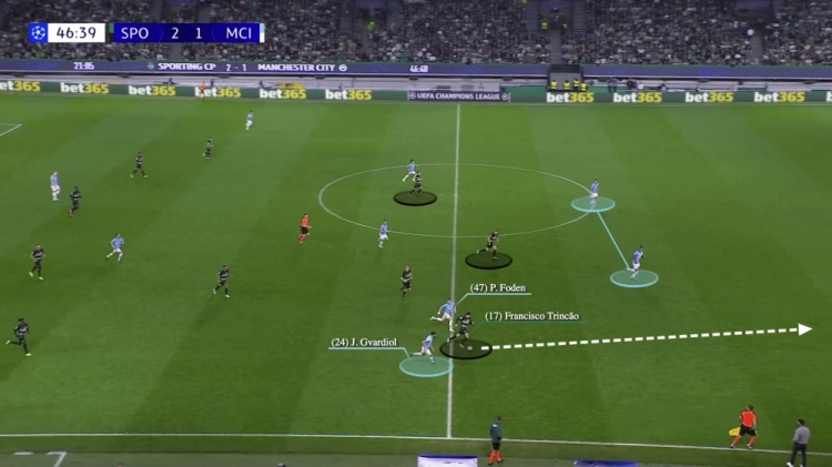 最明顯的例子是對陣葡萄牙體育的比賽。曼城在下半場一開始就失誤了,一個簡單的二過一足以讓貢薩爾維斯從他們的中場身后進(jìn)入。他傳球給邊后衛(wèi)馬克西米利亞諾-阿勞霍,然后皮球越過了埃德森把守的大門。阿勞霍破門后僅86秒,葡萄牙體育就獲得了一個點(diǎn)球。從開球開始,曼城就立即轉(zhuǎn)變?yōu)?-1-3-3陣型來對陣葡萄牙體育的五后衛(wèi)。阿坎吉將球傳給了格瓦迪奧爾,后者在理論上來說是有足夠向前推進(jìn)的空間。