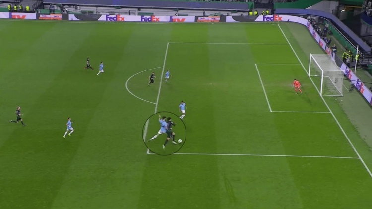 他有三個合理的選擇:傳給馬修斯-努內(nèi)斯,或者將球轉(zhuǎn)移到右路的薩維尼奧,亦或者向后傳遞。但格瓦迪奧爾都沒有選,而是選擇了最困難的路線,傳球給身處重兵集結(jié)區(qū)域的福登,而且他還沒有足夠的傳球精度。葡萄牙體育獲得了球權(quán),立即進(jìn)入了格瓦迪奧爾推進(jìn)留下的空間。