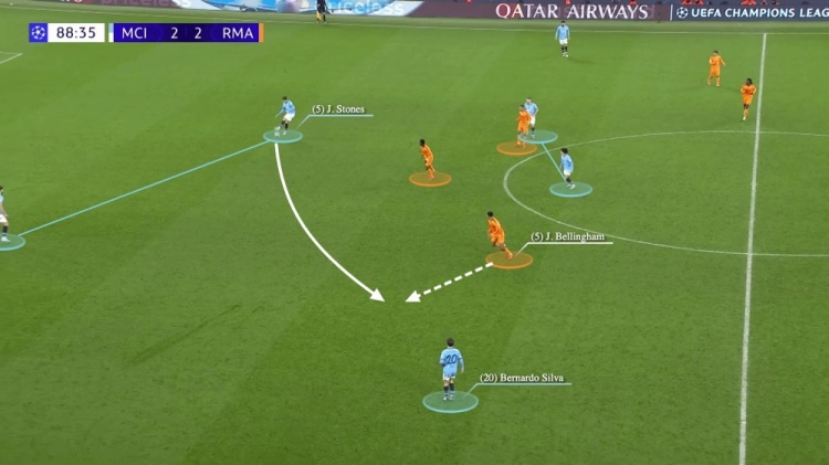 甚至在對陣皇馬的比賽中,此前一直很可靠的斯通斯,也出現(xiàn)了失誤。他在比賽中扮演6號角色,在開局后移動到了左中后衛(wèi)的位置上。他傳球給貝爾納多-席爾瓦,就不是一個合適的選擇。貝林厄姆攔截了這次傳球,并帶球向前推進(jìn),貝爾納多-席爾瓦在禁區(qū)外將其包夾,但這一次并沒有判罰。