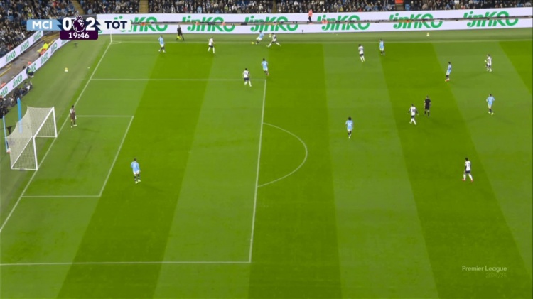 這其中一個復(fù)雜的問題在于右后衛(wèi)凱爾-沃克的位置。他在邊線附近,也沒有出現(xiàn)在上圖之中。這樣的寬度對于曼城這樣的球隊確實(shí)是非常重要的,但一旦出現(xiàn)失誤,就會給對手留下很大的進(jìn)攻空間。也正是因?yàn)槿绱?,熱刺僅用兩次傳球就制造了一對一的機(jī)會。