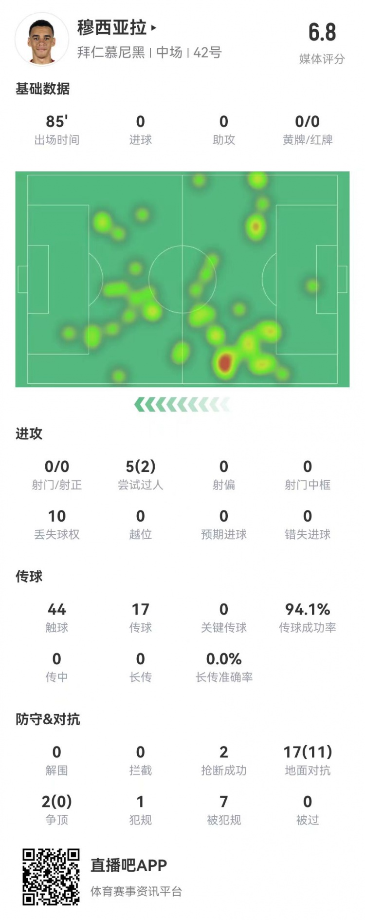 2月16日訊 拜仁在本輪德甲客場(chǎng)0-0暫時(shí)戰(zhàn)平勒沃庫(kù)森,剛剛頂薪續(xù)約的穆西亞拉本場(chǎng)數(shù)據(jù)如下: