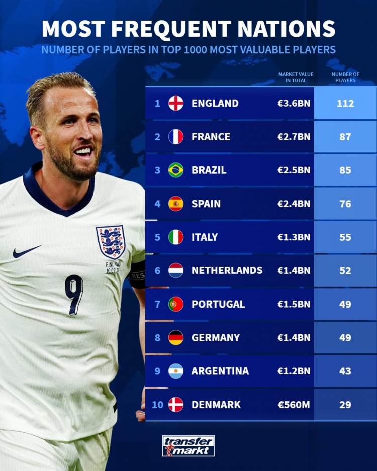 2月16日訊 德國轉(zhuǎn)會市場統(tǒng)計(jì)了身價(jià)前1000名各國球員的人數(shù),并列出榜單,英格蘭112人居首,法國、巴西二三位。