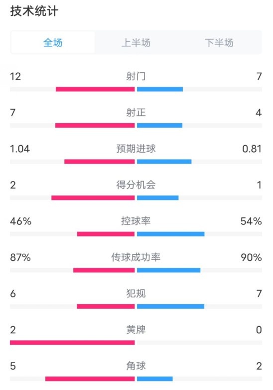 全場(chǎng)比賽數(shù)據(jù)如下(阿森納在前):