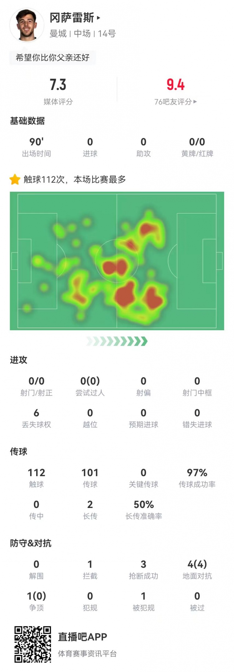 岡薩雷斯本場比賽觸球達(dá)到112次,是全場最多的球員。他的傳球成功率也有97%,同樣是全場最高。在防守端他也有著1攔截3搶斷和4次對抗全成功的戰(zhàn)績,僅有爭頂失敗一次。