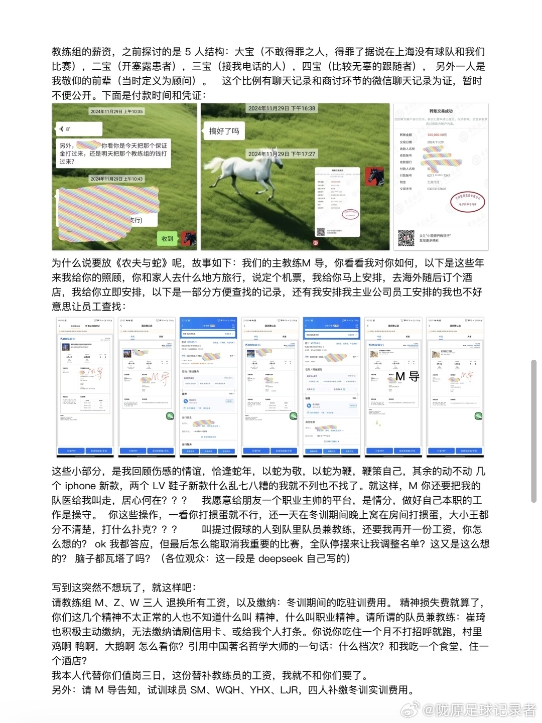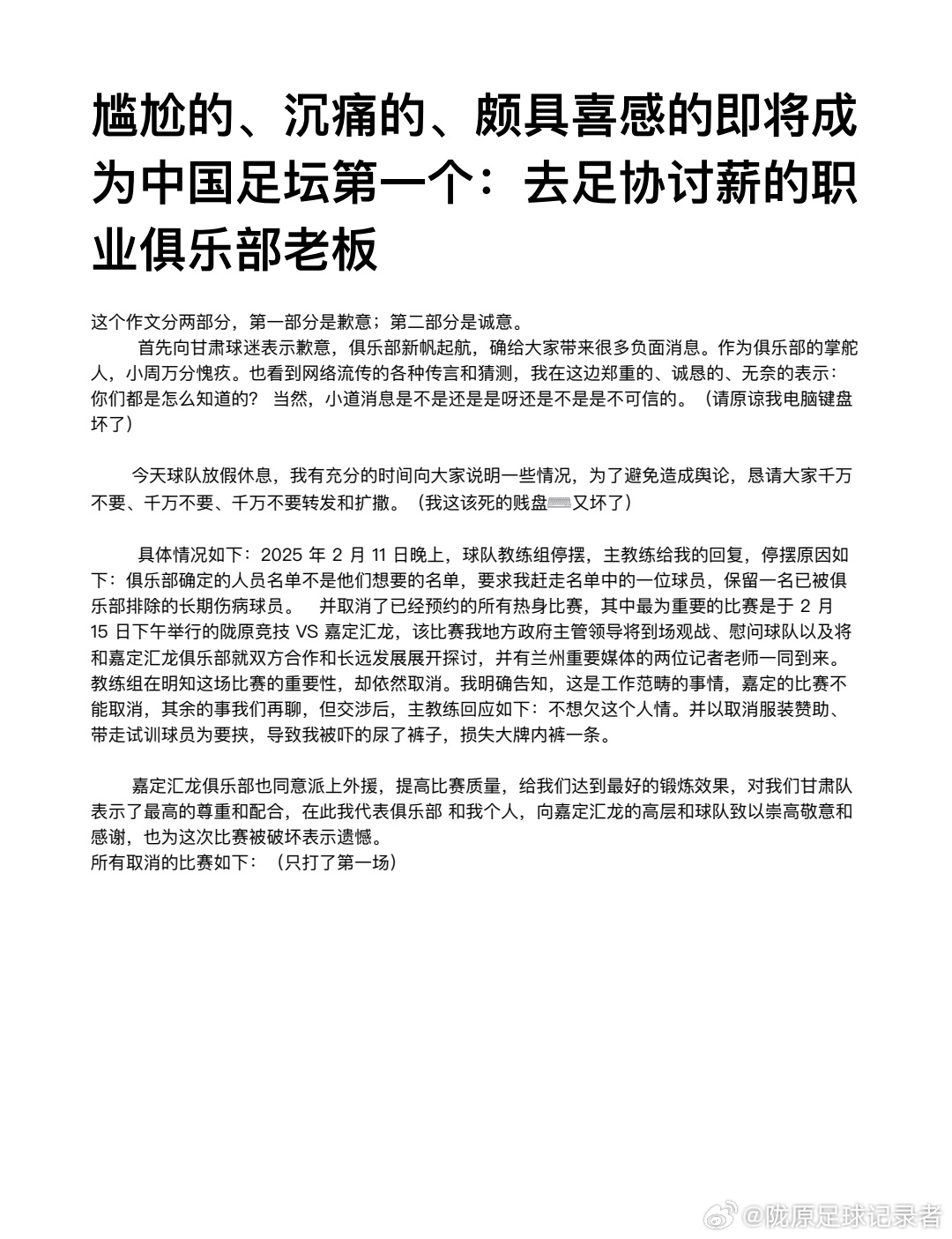 博主寫道:“蘭州隴原競技足球俱樂部遭遇內(nèi)部風波,教練組因投資人不同意引進一名長期處于傷病狀態(tài)的球員而集體停擺失聯(lián),熱身賽被取消,一季度預付的工資尚未退回?!边@種狗血的事情讓我們年輕的蘭州球隊遇到了,支持俱樂部周總維護自身和俱樂部的合法權益,抵制中國足球圈的糟爛人情世故亂象,呼吁那些不熱愛中國足球的沒有多少文化的酒蒙子,寄生蟲們滾出足球圈!