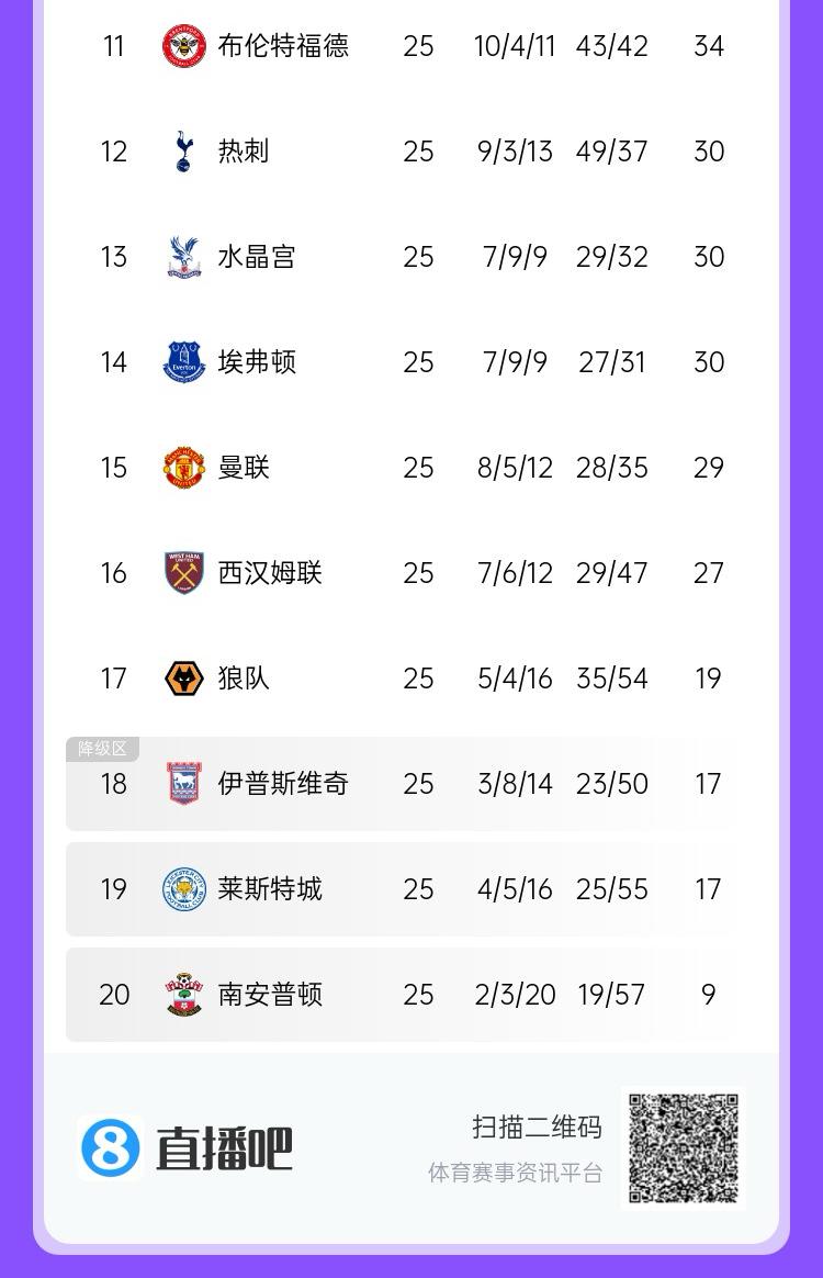 聯(lián)賽前25場,曼聯(lián)8勝5平12負(fù),打進(jìn)28球丟了35球,凈勝球已低至-7球。上賽季,曼聯(lián)最終在英超打進(jìn)57球丟58球,以-1凈勝球收官。